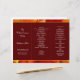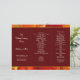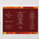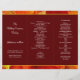 Custom, Fall wedding program template. Dark burgundy colored center panel over a background of orange and yellow fall leaves. White text is easy to customize by section on a three-way folded paper. Images and text are printed on ONE SIDE ONLY. Felt paper is shown and can be changed.