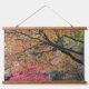 Decorate your living space during the autumn months with this hanging wall tapestry with wooden tops that features the photo image of tree branches full of colorful, autumn leaves. Leaf colors include red and orange. A lovely, botanical image for your autumn home decor.