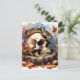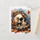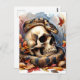 Postcard features watercolor artwork of a brown and black snake wrapped around a human skull with an autumn forest aesthetic.