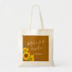 Pretty Autumn/ Fall wedding tote bag features watercolor sunflower bouquet on golden brown background with white customizable text blocks in modern fonts