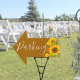 Pretty Autumn/ Fall outdoor wedding parking sign features watercolor sunflower bouquet on golden brown background with white customizable text blocks in modern fonts