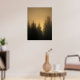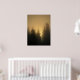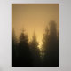 A misty morning in early September, a golden sunrise illuminating the backdrop of spruce trees in shadow.