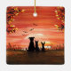 Two dogs and cat silhouette watching the sunset on an autumn evening. Bright, vivid orange fall colors. With two trees on both sides with falling autumn leaves and birds flying towards the sunset. Fall scenery Original Acrylic Painting Art done by Donna Leger for Irony Designs. All Rights Reserved.