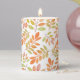 This pillar candle is shown with a autumn time leaves print.