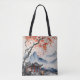 Bright orange and red autumn leaves drife around a temple beside a mountain lake on this beautiful tote bag that illustrates the concept of wabi-sabi.