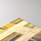The image captures a low-angle view of trees with golden autumn leaves against a clear blue sky. A tall, white building with multiple windows stands adjacent to the trees, partially illuminated by sunlight. Some trees are bare, showcasing their intricate branch patterns. The scene evokes a serene and peaceful atmosphere, highlighting the transition of seasons in an urban environment.