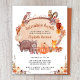 Budget-friendly rustic autumn-themed baby shower invitation with a watercolor wreath composed of a tree trunk, cute watercolors of woodland animals (owl, squirrel, bear and fox), and fall florals foliage and pumpkins. "Adventure Awaits" and the mother-to-be's name are written in a terracotta script.