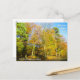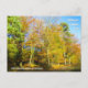A postcard showcasing a sunlit English forest in full autumn color beneath clear blue skies.