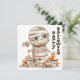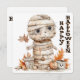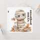 A wide-eyed mummy wrapped in soft beige bandages holds a single autumn leaf, surrounded by festive seasonal elements. At its feet sit cheerful pumpkins, tiny jack-o’-lanterns, scattered acorns, and two silver buckets adorned with ghost faces. A curious black cat and a floating ghost add playful charm, while orange leaves drift around the scene. The design blends Halloween whimsy with cozy fall vibes, capturing the sweetness of the season in one charming moment.