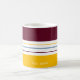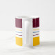 This modern coffee mug features a colorful autumnal pattern in mulberry purple, amber yellow, and white stripes. Personalize it with a name at the bottom.