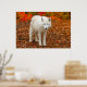 A majestic white wolf with piercing blue eyes stands gracefully on a bed of autumn leaves. The rich reds, oranges, and yellows of the background create a striking contrast with its pristine fur. The wolf's presence, calm and powerful, evokes the spirit of autumn itself.