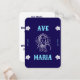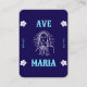 This reverent two-sided prayer card features the Ave Maria in its original Latin form on one side and a serene “Ave Maria” illustration on the front. The design includes an image of the Virgin Mary in prayer, framed by soft floral accents and a deep blue background.