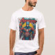The t-shirt design features a dynamic cartoon character, standing amidst symbols of power and justice, such as shields, lightning bolts, and stars. The text "Avengers Assemble" is written in a graffiti style, radiating energy and excitement. The overall design conveys a sense of unity, strength, and superheroic spirit.