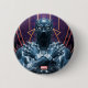 Check out Black Panther standing with his arms crossed over his chest in the Wakanda Forever salute, glowing in the light with a purple and gold tribal pattern background.