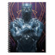 Check out Black Panther standing with his arms crossed over his chest in the Wakanda Forever salute, glowing in the light with a purple and gold tribal pattern background.