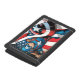 Check out Captain America holding his shield ready, white stripes of the American flag flowing around him.