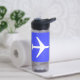 Stylish And Funky White Plane Airplane Aircraft Blue Background Water Bottle to add to your collection. A cool gift / present idea for all who love custom design items, positive vibes, flying, aviation, freedom, traveling, minimalism etc. Change the background colour (blue) to suit your own taste, needs and style. Airways, airlines, boy, girl, hobby, fly, navigation etc.
