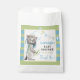 These super cute baby shower favor bags have a striped pattern in green and blue with a light gray text box trimmed in yellow. On the left side, there is a grey wolf holding a green airplane and a big blue balloon. The wolf has a green and blue striped scarf and a blue vintage-type aviator's hat with brown eye goggles. There are also some corner bunting flags in the upper right corner in green, blue, and yellow patterns. The customizable text says, "Ashleigh's Baby Shower" on it in blue and grey lettering with the date also printed in green below and a large "Thank You!" in blue cursive at the bottom. If you require assistance or would like any other matching items, please email your request to niteowlstudio@gmail.com and watch your spam folder for my reply. Thank you!