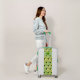 Luggage with a pattern of smiling avocado characters and a customizable name and monogram combination.