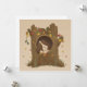 A cute illustration of a beagle in a hollow tree covered in colorful leaves