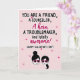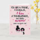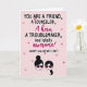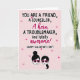 This greeting card features a soft pink background filled with small, light pink heart outlines scattered all around. The main message is written in black, all-caps block letters across the center and reads, “YOU ARE A FRIEND, A COUNSELOR, A TROUBLEMAKER,” like a fun list of reasons someone matters. Mixed in with that, “A hero” and “And totally awesome!” appear in bright magenta script that stands out and feels extra heartfelt ❤️. Along the bottom, two simple women are drawn with black outlines, smiling and facing forward as if posing together. They both wear hot-pink heart-shaped sunglasses, and one has a high bun while the other has a side ponytail, giving them their own look 💌. Near the bottom, the card finishes with “HAPPY GALENTINE’S DAY!” in black capital letters, easy to spot and read. .