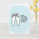 This card features a simple line drawing of casual trousers on the left, outlined in black with a white interior, angled slightly as if leaning in with an affectionate, friendly gesture ❤️. Behind it, a pale sky-blue watercolor wash spreads across the background, giving the scene a light, airy feel. On the right side, large uppercase lettering reads “MOM, THANKS FOR THE AWESOME GENES,” turning the clothing image into a gentle joke about family traits. The text is set in a dark, near-black color that stands out clearly against the soft blue, with the words stacked in tidy lines. The roomy spacing between the illustration and the message makes the design feel open and easy to read. A small 🌼 can fit naturally with the calm palette, echoing the soft background and adding a touch of warmth. The trousers show clear details like a waistband, belt loops, pockets, and a button fly, all drawn with thin, steady lines.