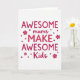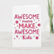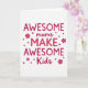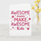 This card features the phrase “AWESOME mums MAKE AWESOME Kids” centered on a bright white background, with the layout arranged to feel like a proud little shout of love ❤️. The words “AWESOME,” “MAKE,” and “Kids” are set in thick uppercase letters in a strong fuchsia-magenta, giving the design a confident, upbeat rhythm. “Mums” sits among them in a softer, flowing handwritten style in the same color, adding a gentle, affectionate touch like a warm note tucked into the middle. The text is stacked in a tidy center alignment, keeping the message easy to read at a glance. Small round dots and simple four-petal flower shapes are scattered around the wording, like friendly confetti that frames the message without crowding it 🌼. Some accents match the main fuchsia, while others shift to a lighter rose tone to create a sweet, caring contrast. The overall look stays airy and uncluttered, with plenty of white space that lets the bright lettering and little florals stand out. A few tiny flower icons and dots sit near the edges around the centered text, balancing the composition on the white field.