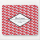 Mousepad with a repeating pattern with 2 red hearts with a white border joined together. A diamond shaped frame layered over top with your text inside. Personalized with a name and text which says: One Awesome Nurse.