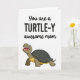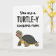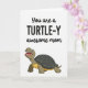 This card features a white background with stacked lettering at the top that reads “You are a” and “awesome mom” in smooth, flowing lettering, with “TURTLE‑Y” centered between them in thicker, all-caps dark text for emphasis. The words sit neatly above the illustration, leaving plenty of open space that makes the message easy to read. Beneath the text, a friendly turtle is shown in profile facing left, wearing an open-mouthed grin that feels like a warm, affectionate joke shared between close family ❤️. Its shell is a deep charcoal with segmented sections, while the underside is a sunny yellow that adds a cheerful contrast. The head, legs, and tail are a soft olive-brown, and the big white eyes with small black pupils give it an eager, adoring look. Inside the mouth, the red interior and small white teeth add a lively touch without crowding the simple design 🌼. The turtle stands alone below the lettering, with crisp outlines and a limited palette of charcoal, yellow, olive-brown, red, black, and white.