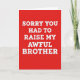 This card features a solid, deeply saturated crimson background that feels both warm and a little daring, like a teasing note shared between close family members ❤️. Centered on the front, large white sans‑serif letters are stacked in neat lines, leaving generous open space around them so the joke lands clearly. The message reads, “SORRY YOU HAD TO RAISE MY AWFUL BROTHER,” delivering a friendly, sibling-style jab that still carries an apologetic tone. A faint shadow behind each letter adds a slight raised look, giving the words a touch of depth without adding extra imagery. The strong red-and-white contrast keeps everything easy to read at a glance, like a straightforward confession said with a half-smile. The overall layout stays minimal, letting the humor stand on its own while the intense red hints at affection beneath the teasing 🌼. The white text sits squarely in the middle of the crimson field, with a subtle drop shadow that trails just below and to the right of each letter.