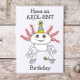 Cute pink axolotl with birthday hat and surprise coloring page inside. Birthday card for little girl or anyone who loves axolotls.