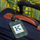 Luggage tag with the tartan for the Ayrshire district of Scotland, a traditional Scottish plaid pattern from 1985 in bright blue and green with red and yellow accents. Personalize with your initial and surname on a light colored plate for easy legibility.