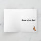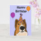 Funny cartoon Shetland Sheepdog birthday card has the Sheltie wearing a party hat and balloons and Happy Birthday on the outside and says: Have a fun day with a tiny boxer wearing a party hat on the inside.