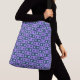 Large Crossbody Bag in a Grid of alternating squares, each containing an irregular shape in a contrasting hue. Purple and blue.