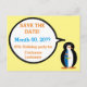 Ms. Penguin is all decked out in her Azorean flag vest and ready to shout the date of your party or other event. Customize the SAVE THE DATE card with personalized details like type of party, date, etc. You can change the background color to fit your party's theme. Change the color of the text, too if you like. Just let Ms. Penguin shout your party details.