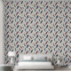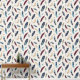 This beautiful, rustic wallpaper has an Aztec style Native American feather pattern in various shades of tan, dark cranberry and blue against a white background.