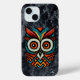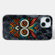 This is a decorative owl made by hand and stylized with Aztec patterns in black, red, turquoise and orange colors on a black marble background.