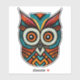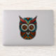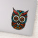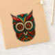 This is a decorative owl made by hand and stylized with Aztec patterns in black, red, turquoise and orange colors.