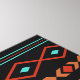 Aztec influenced pattern in symbols/motifs of rust colors and light teal on a black background design.