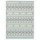 Aztec influenced shapes and line pattern in rust/terracotta colors and a cream color detail on a teal-blue background.