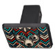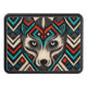 This is a decorative wolf face made by hand and stylized with Aztec patterns in black, red, turquoise and beige colors.
