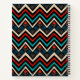 This is a decorative wolf face made by hand and stylized with Aztec patterns in black, red, turquoise and beige colors.