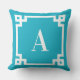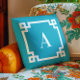 Azure and White Greek Key Border Monogram Outdoor Pillow