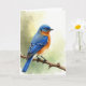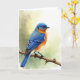 The front design shows a small bird perched on a twisted, textured branch, set slightly off-center as if it just landed and is quietly watching you. Its head and back glow in deep sky-blue tones that melt into warm orange across the chest and sides, finishing with a soft cream belly. The feathers look gently brushed, giving the bird a tender, almost cuddly softness that pairs nicely with its calm, attentive pose ❤️. A dark, glossy eye catches a tiny highlight, adding a hint of connection, like a friendly glance held for an extra beat. Behind it, the background fades into a blurred wash of leafy greens and sunny yellows, suggesting light filtering through trees on a mild day 🌼. Near the top, a short greeting sits in small white letters, while a second line in pale yellow rests near the lower edge without crowding the artwork. The branch shows rough bumps and layered browns, with tiny knots and ridges clearly visible against the soft-focus greenery.
