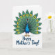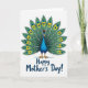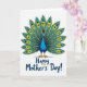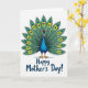 This design shows a stylized bird centered on a white background, its fanned tail spread wide like a gentle show of affection ❤️. The body is shaded in bright blue and deep teal, while the tail feathers shift into emerald tones that feel like a celebratory bouquet. Each feather carries an “eye” pattern made of sunny yellow and rich blue rings, edged with thin black lines that make the details pop without feeling harsh. The bird’s big white eyes and small orange beak give it a friendly, caring expression, as if it’s looking right at someone it adores. A small red crest adds a sweet accent on top, and slender orange legs stand over a soft blue shadow that lightly grounds the figure. Below the bird, the greeting “Happy Mother’s Day!” sits centered in deep blue lettering, with a smooth, flowing look that feels tender and inviting 🌼. The tail’s repeating circles form a neat, symmetrical fan that fills most of the card front with layered greens, blues, and yellow highlights.