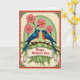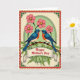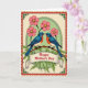 Designed with a vintage-style greeting card look, the illustration feels calm and affectionate, like a quiet moment shared between close friends or sweethearts ❤️. Two brightly feathered birds in deep blue and warm orange sit close together on a thin branch, facing one another with beaks nearly touching and eyes turned in a tender gaze. Behind them, leafy green foliage fills the scene, and a few soft pink flowers with yellow centers float near the top like early spring blooms 🌼. The main image sits inside a pale green oval that keeps the focus centered. Around it, a cream background supports a scalloped red border, with small green decorative flourishes tucked into the corners. Across the lower middle, a curved banner holds the message in red lettering, placed so it gently overlaps the bottom of the oval. The banner’s ends curl upward, and the red border forms rounded scallops all the way around the edge.
