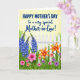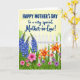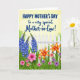 This Mother's Day card opens on a soft yellow sky with a friendly blue message placed across the upper area, like a note floating above a sunny morning. Below it, a white picket fence stretches straight across the scene, giving the garden a cozy, cared-for feel. In front of the fence, tall blue flower spikes with small yellow centers stand close together, leaning as if they’re sharing a quiet moment ❤️. Bright orange lilies spread their petals nearby, adding warmth that feels like an affectionate hand on a shoulder. Lower in the garden, small pink and lavender blooms peek out from thick green leaves, creating the sense of close companionship among the plants. The lettering stays up top in blue, while the rest of the space is filled with layered greens and cheerful blossoms that draw your eye downward 🌼. The fence is crisp white, and the flowers cluster densely along its base with blue, orange, pink, and lavender tones.