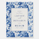 Celebrate your union with elegance and serenity through our “Azure Blooms” collection—where vibrant blue toile patterns meet refined design to bring your wedding vision to life. This collection features an elegant style with a cohesive blue toile floral theme, perfect for weddings. The artwork is characterized by intricate botanical designs in varying shades of blue and white, creating a sophisticated and timeless look. Recurring motifs include lush flowers and foliage, which adorn various items such as invitations, tableware, wine labels, menus, and thank you cards. These elements are meticulously arranged to evoke a sense of romance and refinement. The versatility of the design allows it to be applied across multiple product types, ensuring a harmonious aesthetic throughout the wedding celebration.