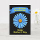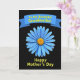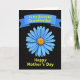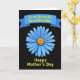 This card features a single daisy-like flower centered on a deep black background, with slim blue petals spreading out evenly around a golden-yellow center that feels like a warm glow. The strong contrast makes the bloom look like it’s lit from within, like a quiet spotlight on a loving moment ❤️. Above the flower, a curved ribbon in a slightly darker blue arches across the top and holds a short message in bright yellow letters. The lettering is thick and easy to read, and its sunny color echoes the flower’s center as if the words and bloom are sharing the same warmth. Below the flower, a second line of bright yellow text sits near the bottom, balancing the design and adding a gentle, affectionate tone without needing any extra imagery 🌼. The petals are drawn with smooth, precise edges, and the center is packed with tiny textured dots that add depth. The overall layout is symmetrical, with the blue ribbon and yellow text framing the flower against the unbroken black field.