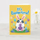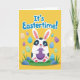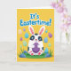 This card features a chubby white bunny with dark patches around its wide eyes, holding a single purple egg close to its belly as if saving it for someone special 🐰. The bunny sits near the lower center, with soft pink inside its ears and on its little paw pads, giving it a gentle, affectionate look. Across the top, a seasonal greeting appears in large blue letters with a thin white outline, standing out against a bright yellow background. Scattered around the bunny are many pastel eggs in aqua, lavender, soft green, and muted orange, decorated with small stripes and curling patterns that feel like shared surprises 🐇. A green band along the bottom suggests spring grass, grounding the scene like a quiet spot for a friendly egg hunt. Small blue stones and pointed blades of grass dot this lower area, adding texture without crowding the design. The overall layout keeps the bunny and greeting as the main focus, with the eggs framing them like little gifts passed between friends 🌷. The purple egg is centered in the bunny’s paws, while pastel eggs float around it, and the blue greeting spans the upper third on the yellow field.